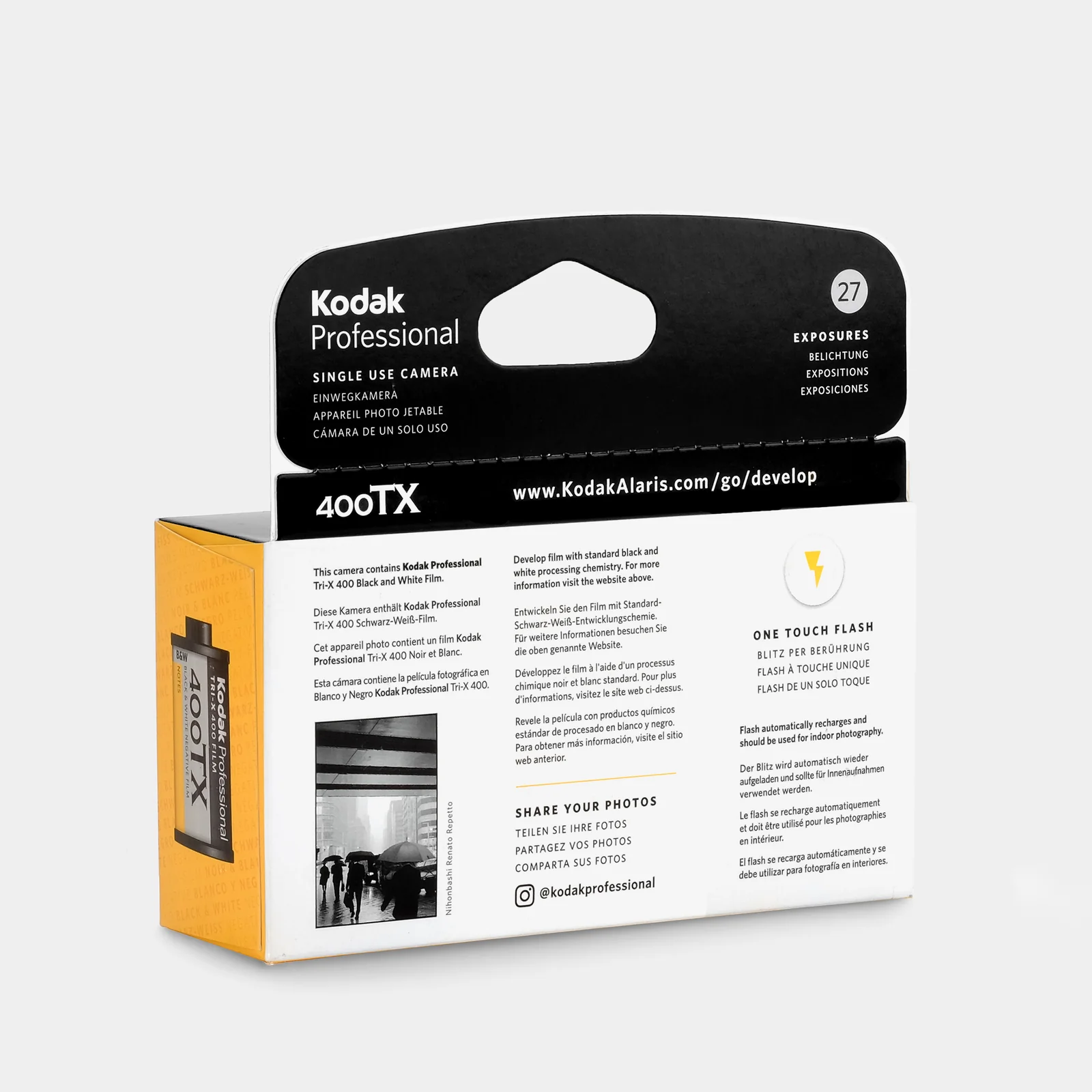 Kodak Professional Tri-X 400 是一款專業級即棄式35mm底片相機,內建27張高感光度Tri-X 400底片,適合低光環境與街頭攝影。其經典黑白影像風格與簡易操作,讓攝影愛好者輕鬆捕捉高對比與細膩質感的畫面。